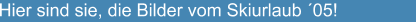 Wie in der Mail angekündigt, so findet Ihr hier die von mir "geschossenen" Bilder vom Skiurlaub 2005 (zur Vollständigkeit benötige ich auch noch mal die Schnappschüsse von der anderen Kamera. Bitte mir mal diese zusenden, damit ich die Bilder zusätzlich einfügen kann.